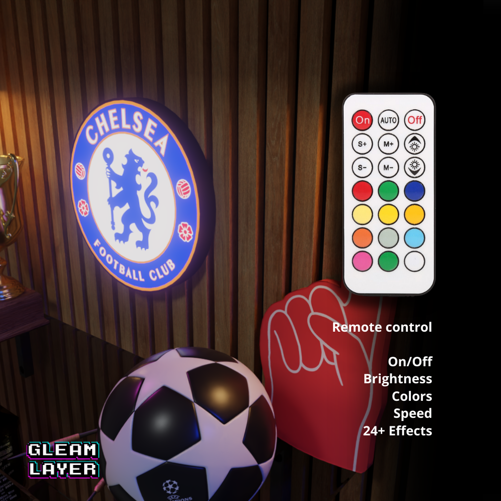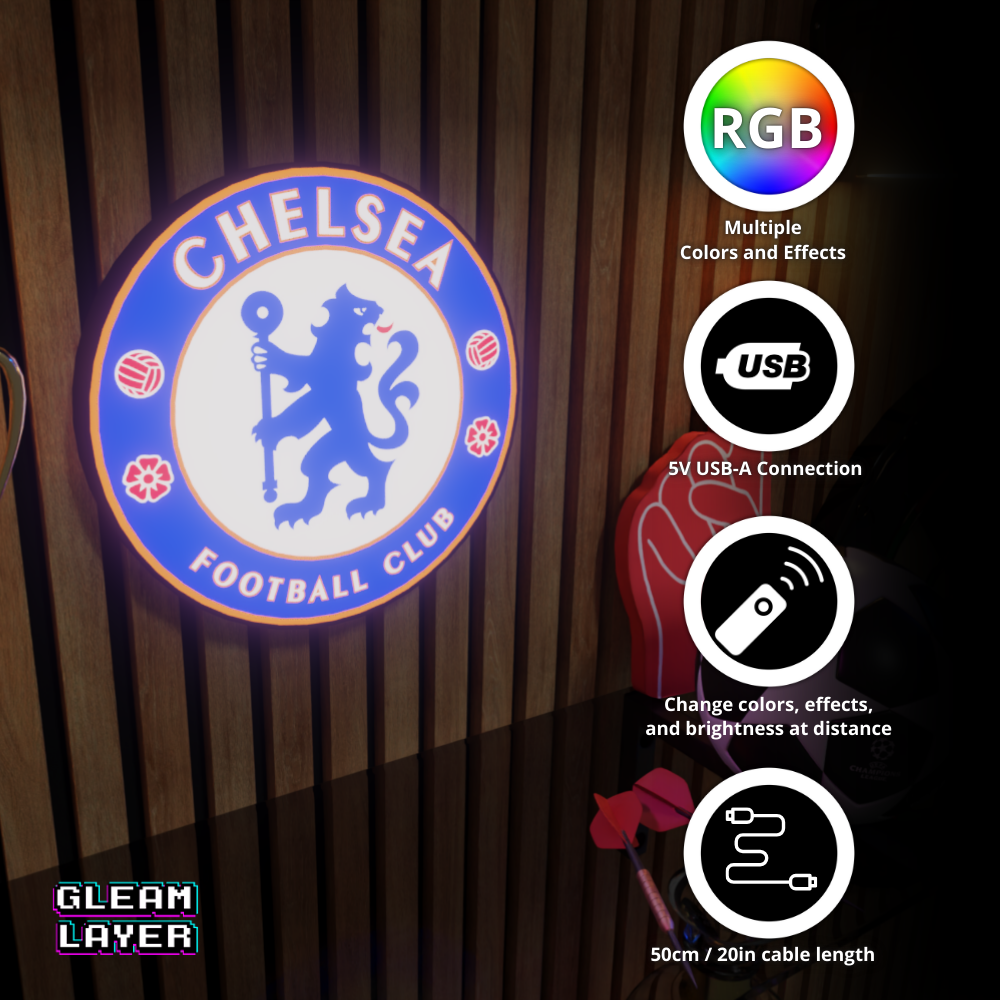Bring the roar of Stamford Bridge into your space with the Chelsea FC Logo LED RGB Wall Display Light Sign — perfect for passionate Blues fans, collectors, and adding game day energy to any man cave, sports bar, or fan room!