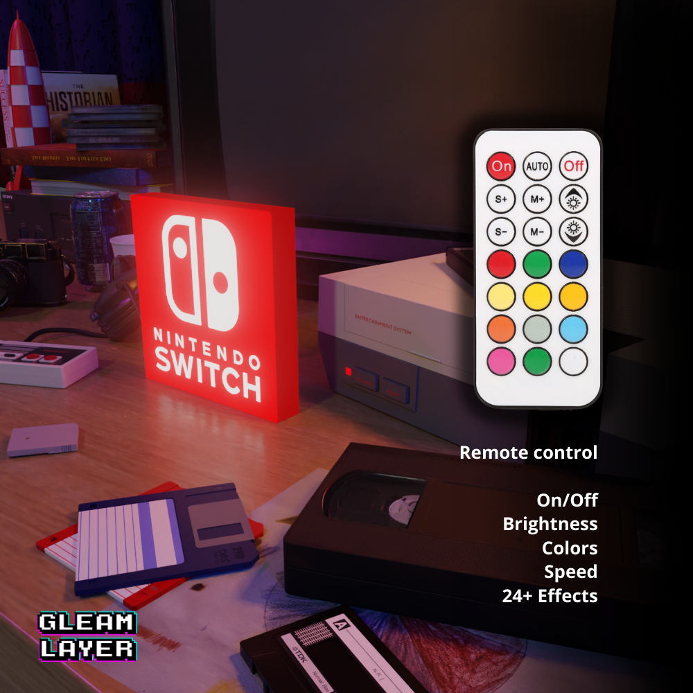 (Nintendo Switch LED sign, gaming light decor, retro console lighting, USB-powered gaming light, Switch fan gifts, gaming room lighting, remote-controlled LED light, gaming memorabilia, Nintendo light for game station, gaming accessory, fan room decor, Switch wall decor, LED light for gamers, themed light for gaming setups, retro gaming room decor, light-up gaming sign, unique gifts for gamers, console-themed LED light, Switch collector’s item, room feature decor)