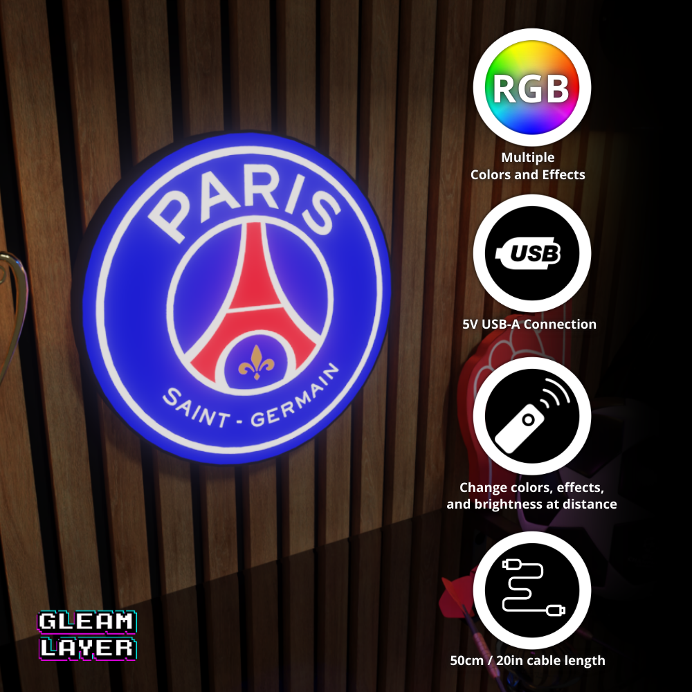 Paris Saint-Germain FC LED RGB light sign, PSG football logo lightbox, Ligue 1 illuminated wall sign, PSG fan collectible LED decor, Parc des Princes man cave light, Paris Saint-Germain team LED wall display, Ligue 1 merchandise LED sign, customizable PSG LED lightbox, game day fan room decoration, PSG supporters LED wall art