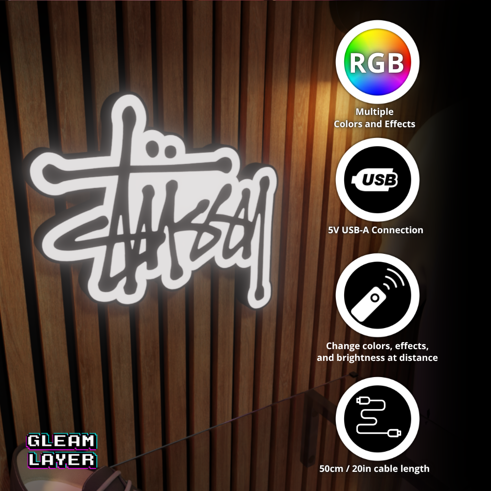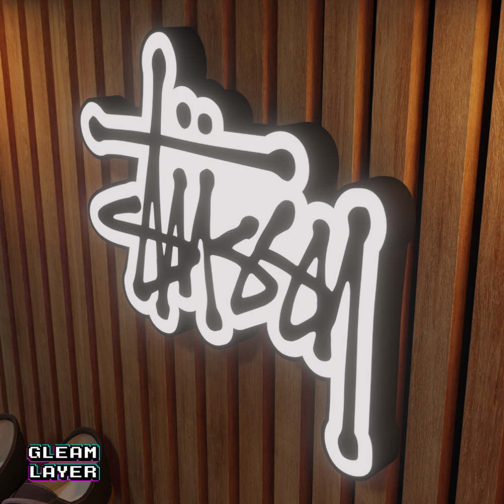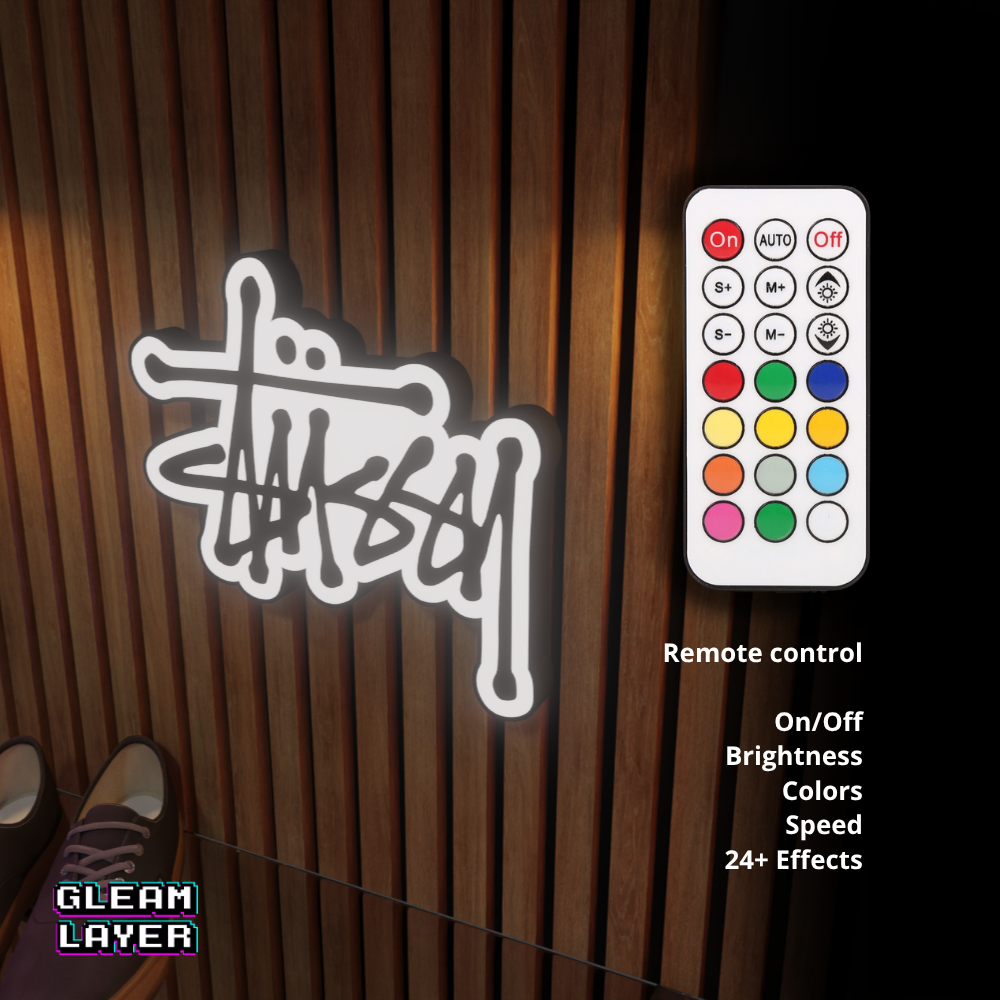Stussy LED RGB light sign, Stussy logo light, Stussy illuminated wall art, Stussy brand wall decor, Stussy streetwear LED sign, Stussy neon style lightbox, streetwear room decoration, urban fashion brand LED display, collectible Stussy light for home, RGB wall sign for streetwear lovers, fashion store LED wall sign, Stussy clothing shop illuminated display, man cave LED sign, gamer room wall light, hypebeast room decor, LED Stussy logo lamp, retail store lightbox, modern urban home decoration, customizable RGB brand sign