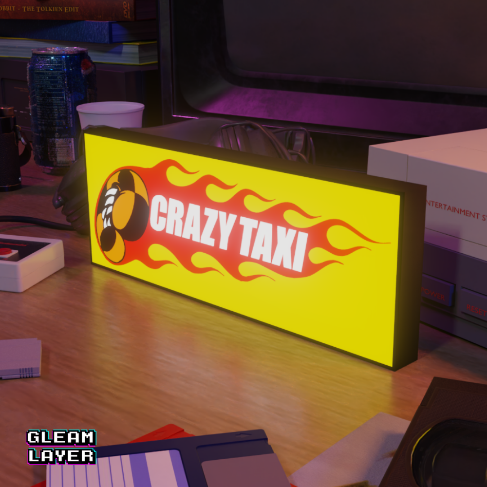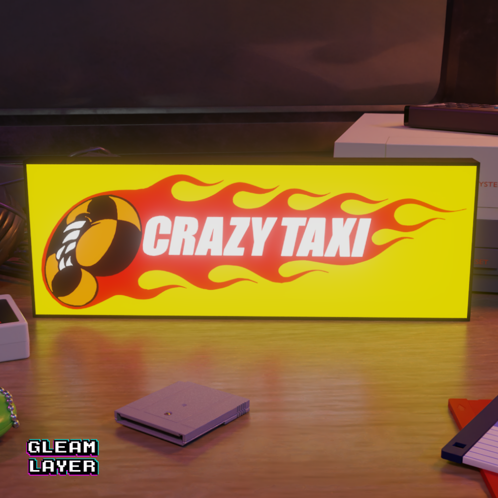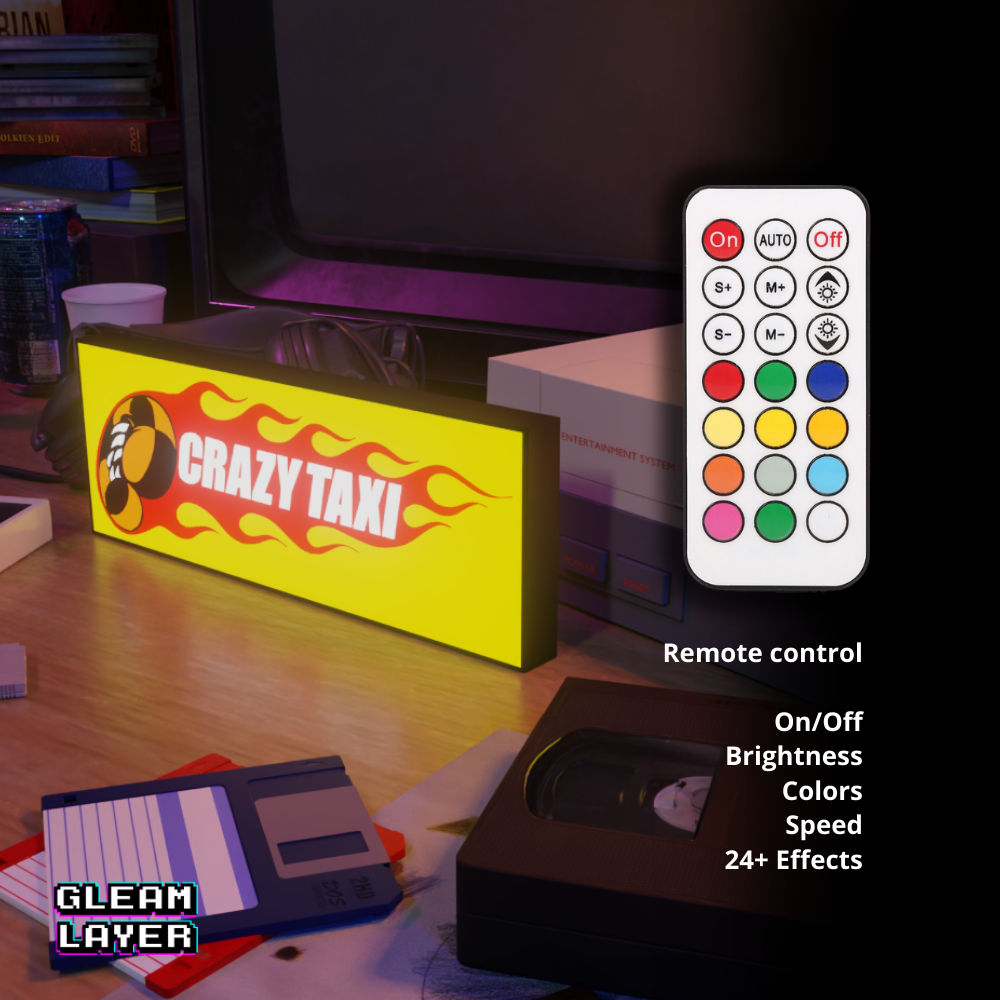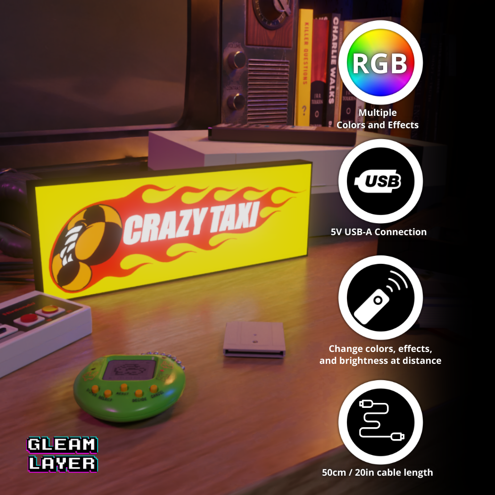 Crazy Taxi LED RGB light sign, Crazy Taxi arcade lightbox, SEGA retro gaming LED wall sign, Crazy Taxi illuminated collectible, gamer room RGB wall decor, man cave retro arcade light, SEGA classic game LED display, customizable gaming LED sign, Crazy Taxi fan merchandise, video game arcade wall art