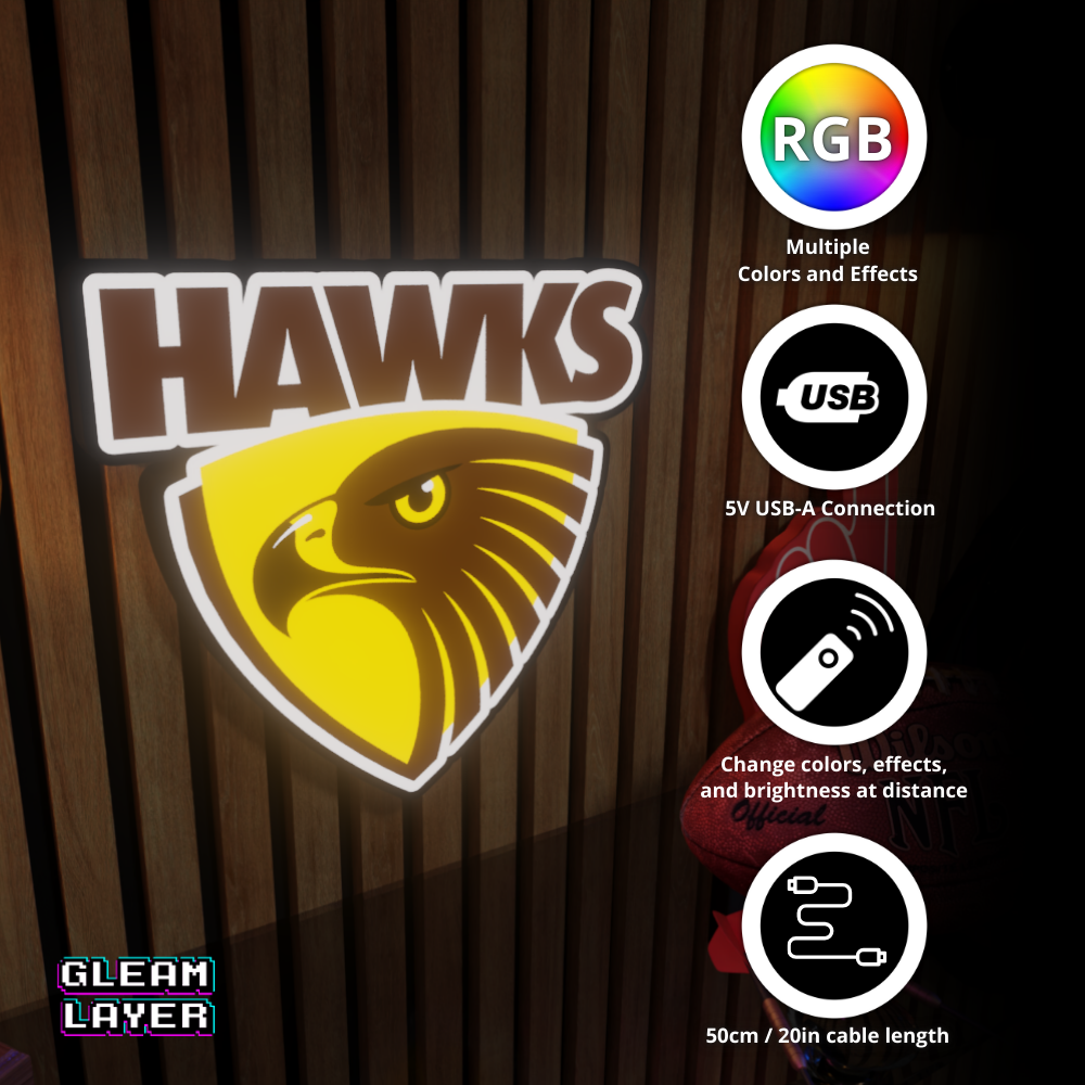 Hawthorn Hawks AFL LED sign, Hawthorn logo LED wall light, Australian Football League illuminated sign, AFL team collectible LED lightbox, Hawthorn Hawks fan room decor, AFL RGB wall lighting, Aussie Rules football LED display, Hawks supporter LED light, AFL game day illuminated sign, Hawthorn Hawks merchandise LED decor