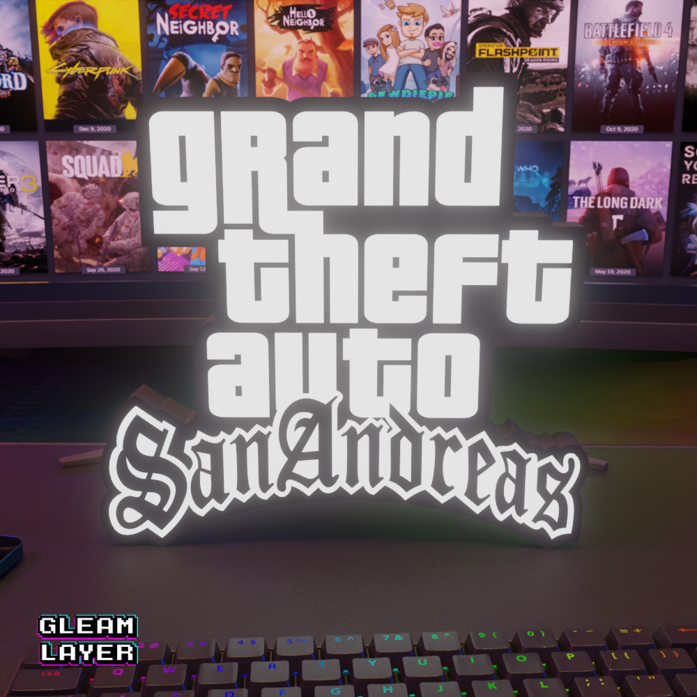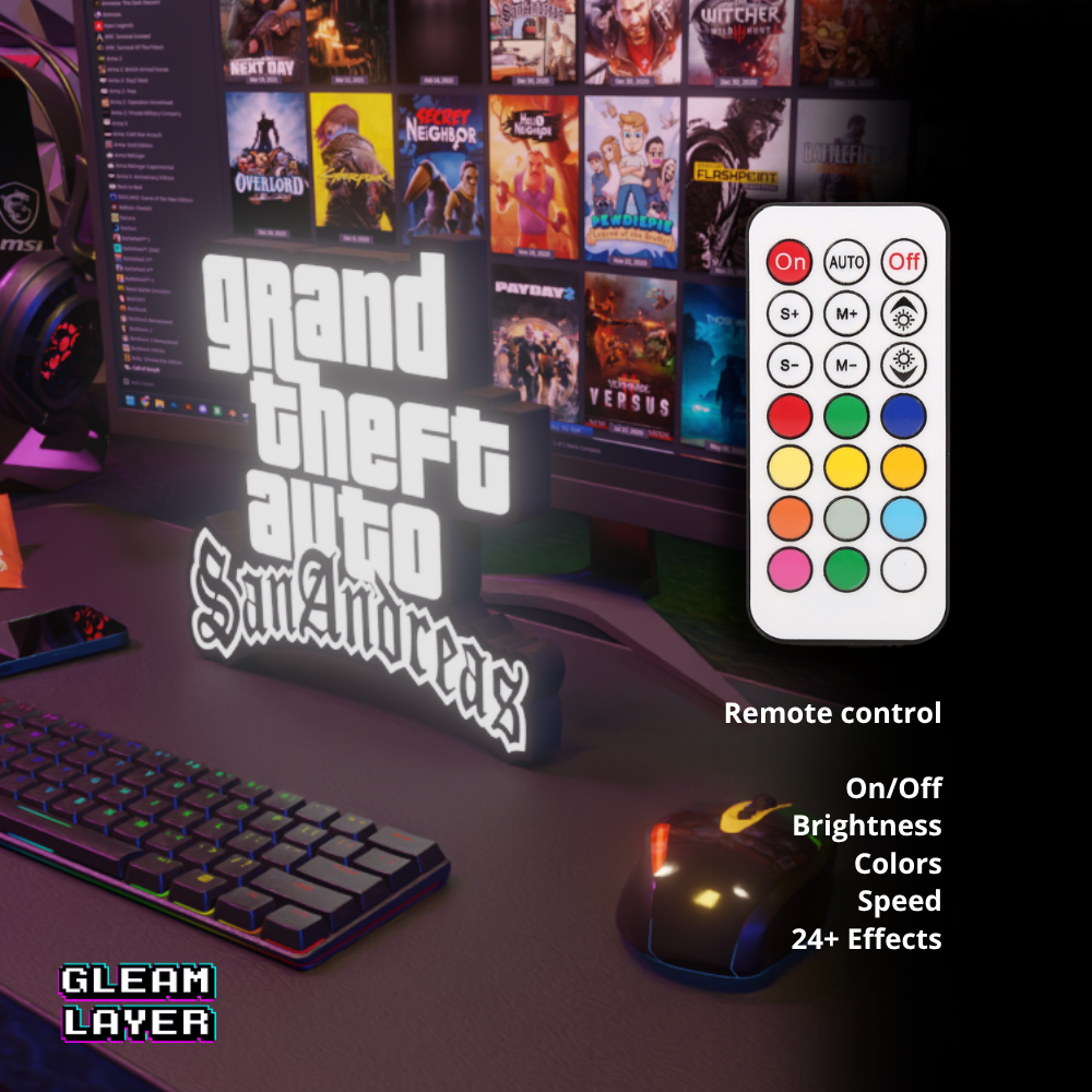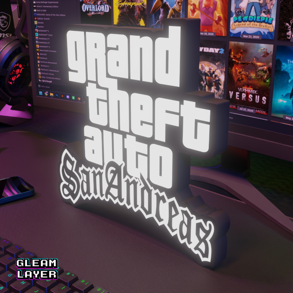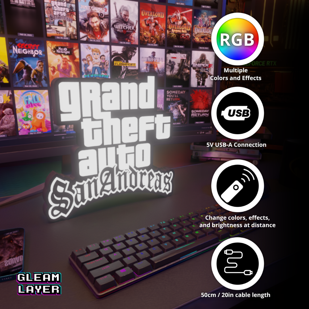 GTA San Andreas LED Light Sign, Grand Theft Auto gaming decor, gamer room lighting, Rockstar Games collectible, RGB lightbox for gamers, San Andreas nostalgia sign, video game gift, man cave decor, retro gaming setup, crime game memorabilia