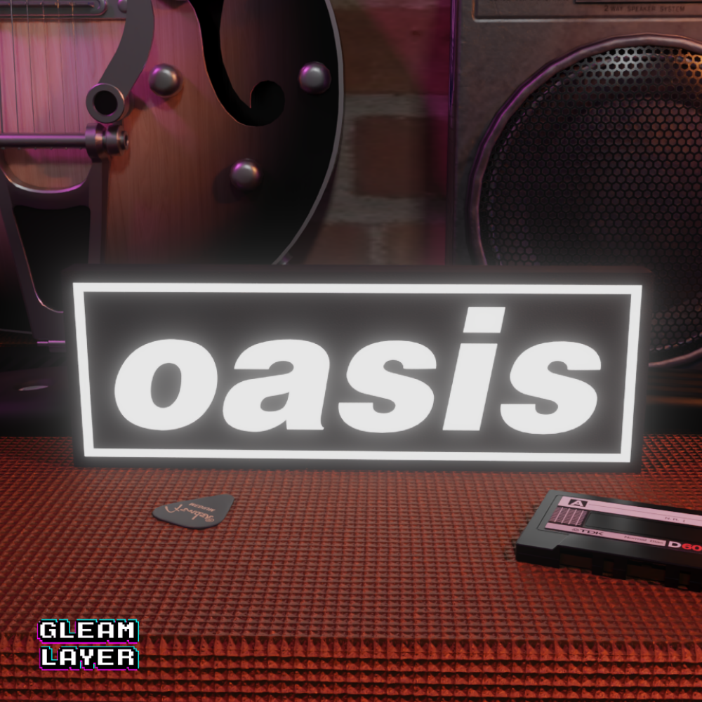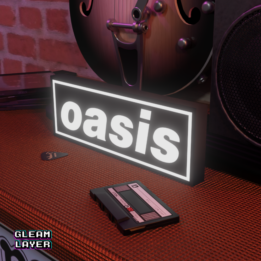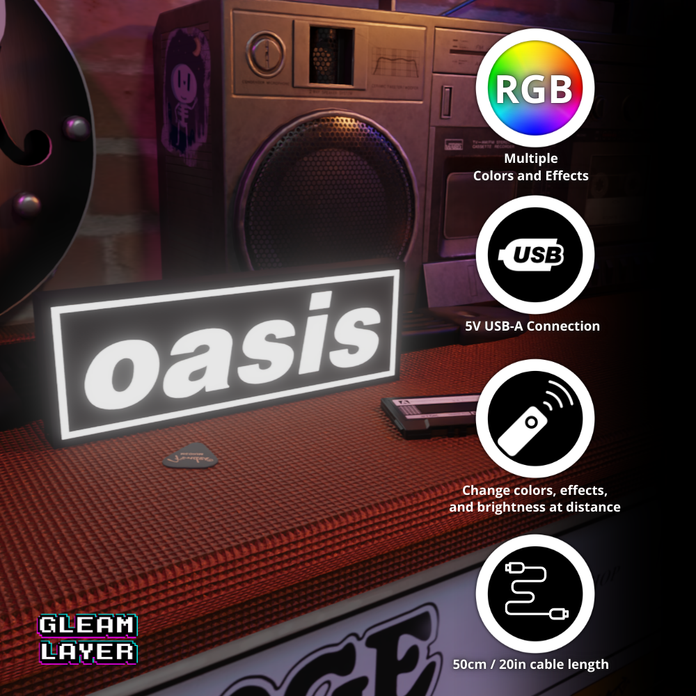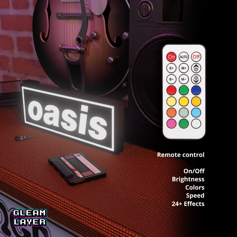 Oasis LED RGB light sign, Oasis band logo illuminated sign, Britpop LED wall decor, music fan room LED sign, collectible band lightbox, Oasis merchandise LED display, man cave music light, concert-inspired LED wall art, customizable RGB Oasis sign, rock band LED accent, gamer room music decoration